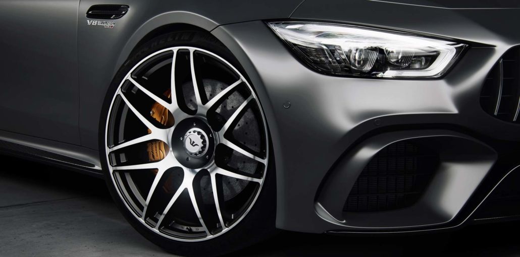 Just like other manufacturers, Mercedes AMG wants to offer to their customers the maximum possible wheel-tire combination, what makes business not easier for tuners. Optionally, the GT63 AMG rolls out of the sales hall with 275/35/21 and 315/30/21 tires. So there´s not much space for TUV allowed improvement and so far no tuner from Europe has been able to present a suitable 22 inch retrofit for the model type X290. Wheelsandmore took care of the problem and developed appropriate rims for the matching Michelin tires. The tuning company from Germany equips the “Cummander” with black bi-color rims of the type ZV-1 sizing 10.5×22 offset 24 and 11.5×22 offset 22 with Michelin tires of sizes 285/30/22 and 335/25/22. The face of the rims has been cnc trimmed to the original look and sealed with a clear varnish.