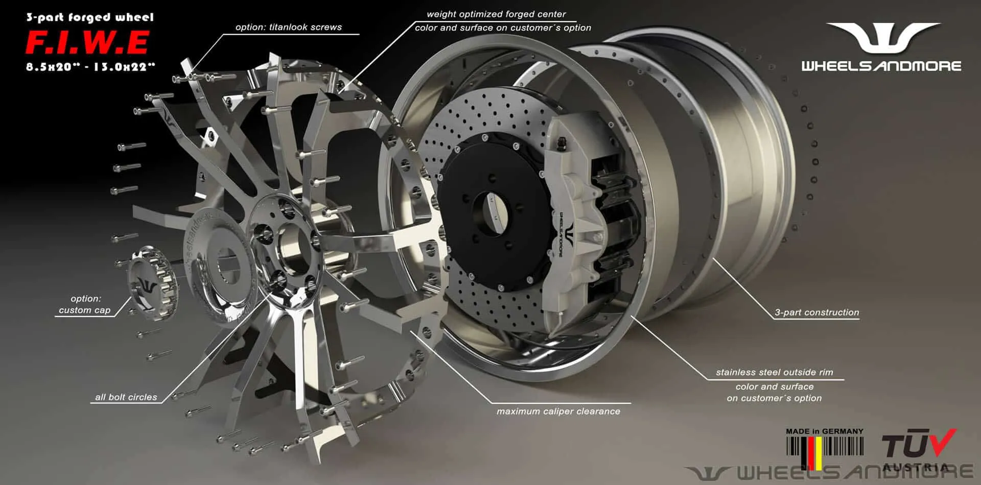 State of the art ultra concave wheel design, customized on order to each width and offset. F.I.W.E. wheels are made of 3 pieces and therefore can be taylored according to customers options in color and surface. Each wheel handcrafted in Germany exceptionel with raw parts from German production. TUV approved high-end wheels.